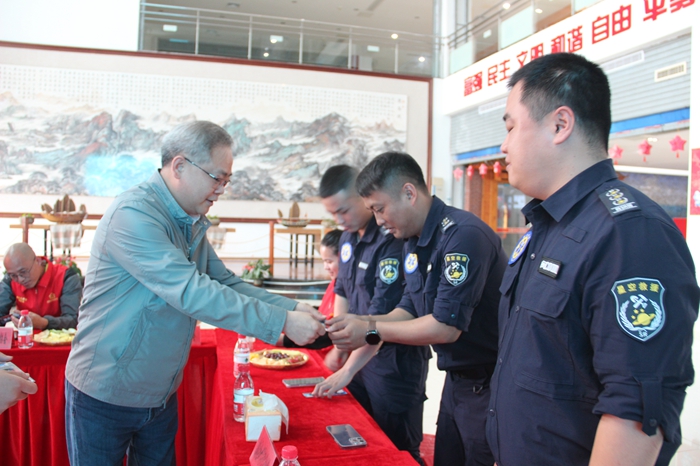 現(xiàn)場(chǎng)為志愿者發(fā)放禮遇小禮品(泉港區(qū)委文明辦供圖 陳燕燕攝)