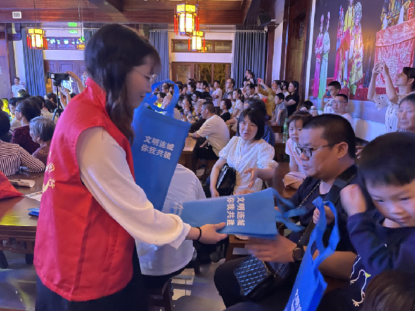 活動(dòng)現(xiàn)場,連城縣木偶藝術(shù)傳習(xí)中心的演員和文化志愿者們表演了古典舞《花開忘憂》、少兒舞《魚兒歡歌》、木偶長綢舞、木偶折子戲、魔術(shù)、太極拳表演等精彩節(jié)目,向市民群眾展示了積極、健康、向上的精神面貌。當(dāng)晚最受歡迎的創(chuàng)城知識有獎(jiǎng)競答環(huán)節(jié)在節(jié)目表演中穿插進(jìn)行,工作人員準(zhǔn)備了扇子、防曬袖套、無紡布袋、公勺公筷等小獎(jiǎng)品,把一個(gè)個(gè)與群眾息息相關(guān)的創(chuàng)城問題作為互動(dòng)內(nèi)容,市民們爭相參與答題,現(xiàn)場氣氛十分活躍??h新時(shí)代文明實(shí)踐中心的志愿者們還向現(xiàn)場觀眾發(fā)放了創(chuàng)城倡議書等宣傳品。
