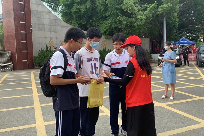 志愿者為考生送水(泉港區(qū)委文明辦供圖)