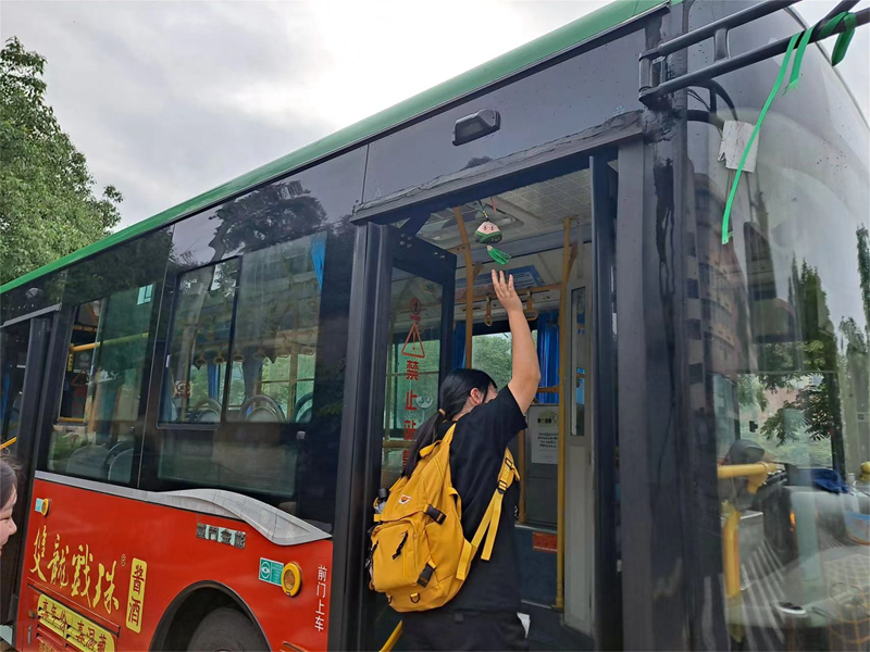上車前,南平公交公司一分公司經(jīng)理鄭敏說:“同學(xué)們,今天你們就要迎戰(zhàn)高考了,南平公交的叔叔專門來接你們上考場。大家看到車門上高高懸掛的粽子了嗎?它寓意著‘高中’,大家在車的時候抬手摸一摸,一定考運旺旺,一舉高中。”