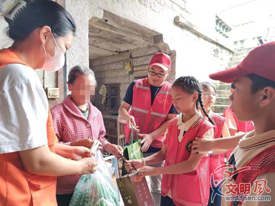 廈門翔安旅游發(fā)展有限公司聯(lián)合莊家寶蔬菜專業(yè)合作社還為社區(qū)老人準備了新鮮的蔬菜、豆腐、茶杯套裝,積極為學生們樹立“為仁”“助人”的優(yōu)秀榜樣。學生們有的拎著一大包新鮮蔬菜,有的拎著新鮮的豆腐,有的提著套杯走進面前埔村一戶戶貧困老人家中,向老奶奶、老爺爺問好,祝他們身體健康。