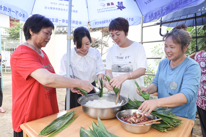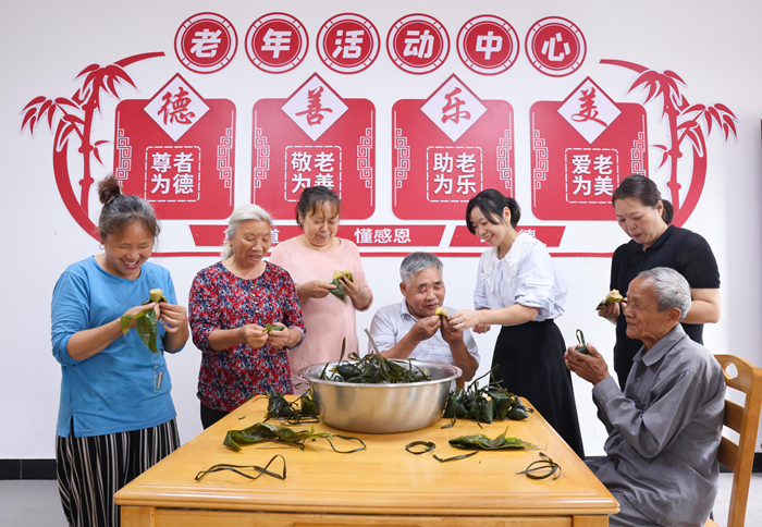 洋墩鄉(xiāng)的志愿者們在江墩村為長者食堂里的老人包粽子(徐華山 攝)