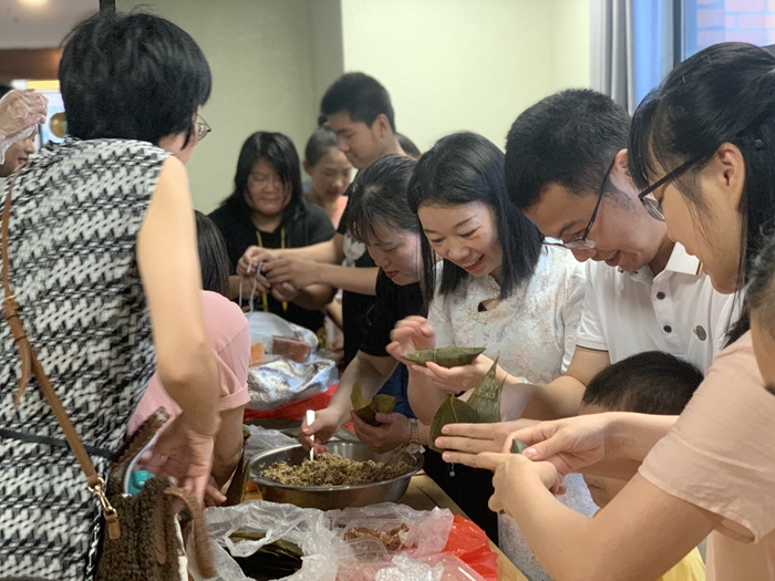 “鋪好粽葉,放入米和蛋黃,繩子一扎,臺味蛋黃肉粽就包好了?!被顒蝇F(xiàn)場,兩岸同胞歡聚一堂,共話佳節(jié)趣事?!岸宋绻?jié)是我們中國的傳統(tǒng)節(jié)日,大家聚在一起包粽子,熱鬧又好玩,節(jié)日氛圍也更濃了?!蓖跖空f。