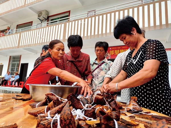 在雷峰鎮(zhèn)蕉溪片區(qū)“黨建+”鄰里中心,精彩的非遺文化——木偶戲在舞臺上輪番上演,轄區(qū)老人與志愿者在愛心食堂里一同捋粽葉、包粽子、捆棕繩,共迎端午?;顒舆€為全村60歲以上老人送上大米和糧油等慰問品,用心用情關懷留守老人的生活。