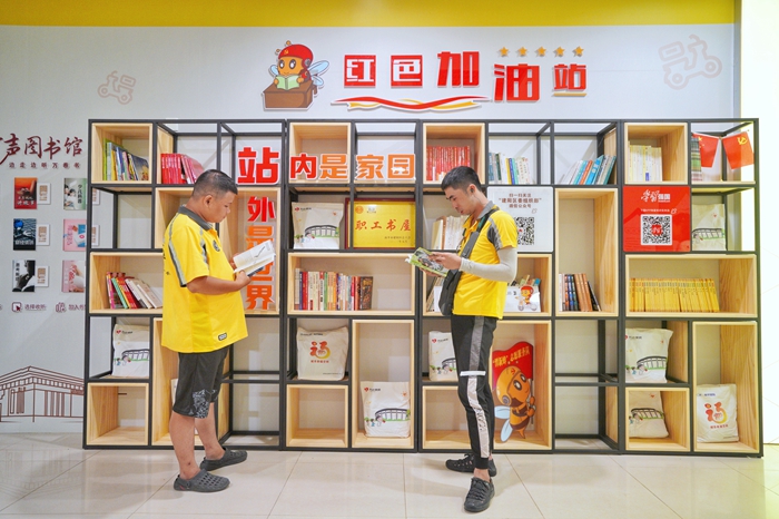 外賣小哥在驛站內(nèi)閱讀書籍 吳大灼 攝