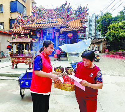 西湖社區(qū)志愿者在宮廟前分發(fā)移風(fēng)易俗倡議書。(西湖社區(qū) 供圖)