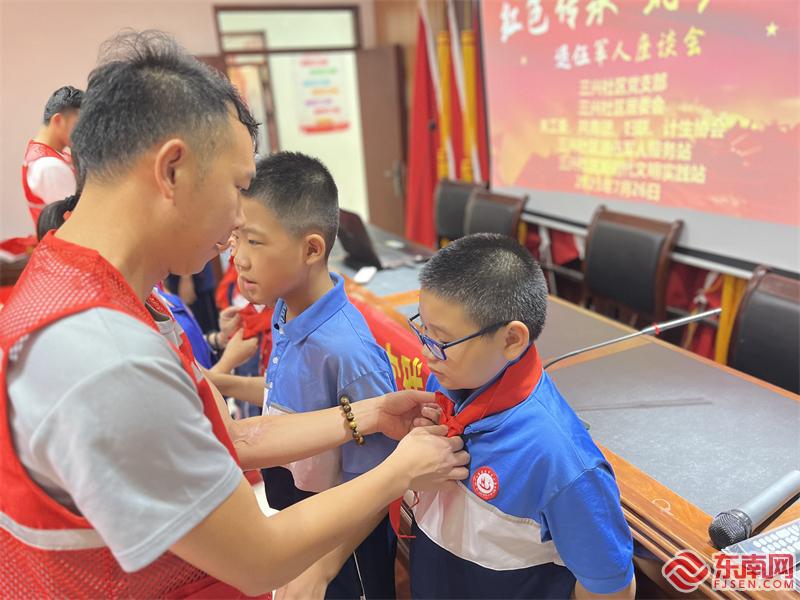 退伍軍人與社區(qū)工作者為青少年佩戴紅領(lǐng)巾(王文婷 攝)