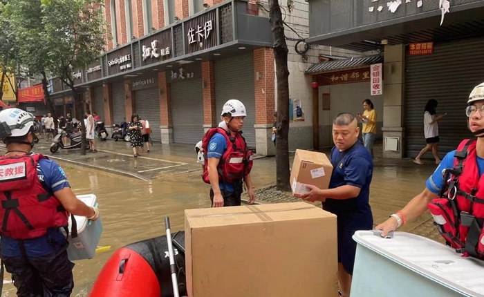 約10分鐘后,一支由3名藍(lán)天救援隊隊員、1名消防隊員和1名社區(qū)工作人員組成的救援小組集結(jié)完畢?!敖?jīng)過觀察發(fā)現(xiàn),衛(wèi)生院后門水位較低,當(dāng)時可以通行。衛(wèi)生院內(nèi)的工作人員將藥品打包好放在后門,救援小組駕著沖鋒舟抵達(dá)后門,可轉(zhuǎn)運(yùn)出藥品?!备G迨兴{(lán)天救援隊隊員陳祖應(yīng)告訴記者。