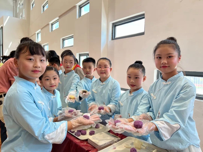 除了活動(dòng)主舞臺(tái)外,在制作月餅等習(xí)俗體驗(yàn)區(qū),志愿者們帶領(lǐng)大家一起制作月餅。只見學(xué)生們有的揉面,有的包豆餡,有的壓模具,在一片歡聲笑語(yǔ)中,一個(gè)個(gè)精致的月餅呈現(xiàn)在大家的眼前,隨后大家圍坐一起品嘗月餅,現(xiàn)場(chǎng)洋溢著濃濃的節(jié)日氣息。