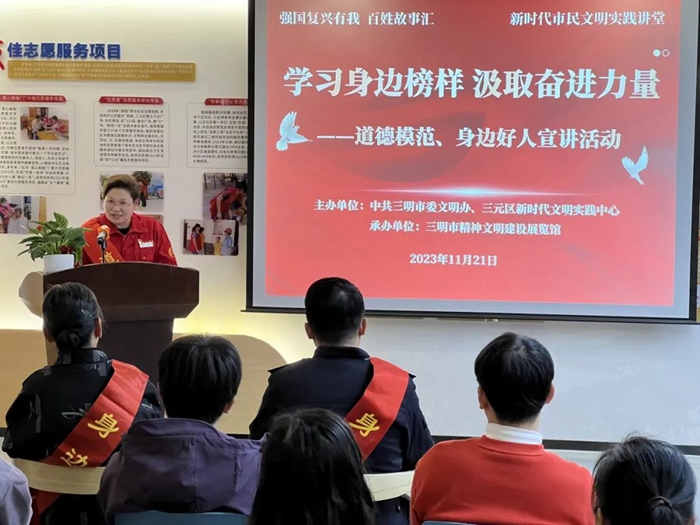 文明風(fēng)11月23日訊 一個好人帶動一群人,一群好人感動一座城。為深入學(xué)習(xí)宣傳貫徹黨的二十大精神,培育和踐行社會主義核心價值觀,結(jié)合學(xué)習(xí)貫徹習(xí)近平新時代中國特色社會主義思想主題教育“我學(xué)榜樣思奮進(jìn)”活動,11月21日,三明市委文明辦、三元區(qū)新時代文明實踐中心聯(lián)合開展“學(xué)習(xí)身邊榜樣 汲取奮進(jìn)力量”道德模范身邊好人宣講,70余名觀眾到場聆聽。