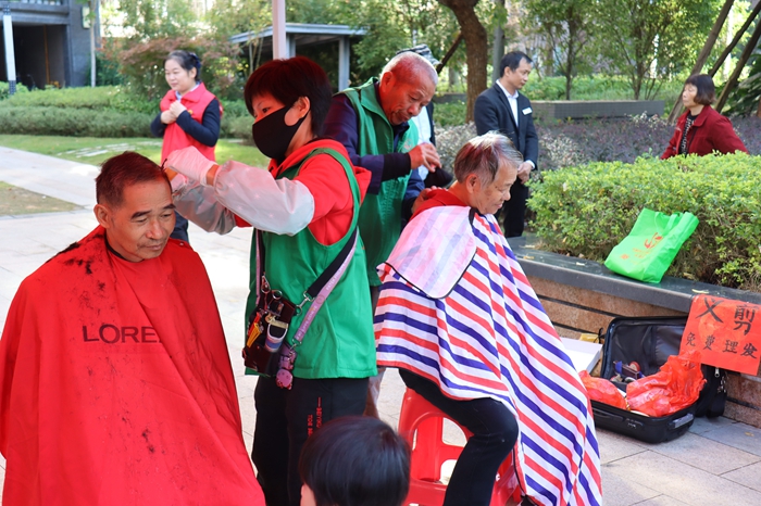 在便民義診服務(wù)區(qū),志愿者們熱情地為居民們提供量血壓、測血糖、眼科檢查、中醫(yī)診脈、口腔保健等服務(wù);在義剪活動服務(wù)區(qū),志愿者們熱情、細心地根據(jù)群眾的需求理出他們適合的發(fā)型;在反詐知識有獎問答活動服務(wù)區(qū),各類知識問答妙趣橫生……11個志愿服務(wù)區(qū),讓居民們的臉上洋溢著幸福的笑容。