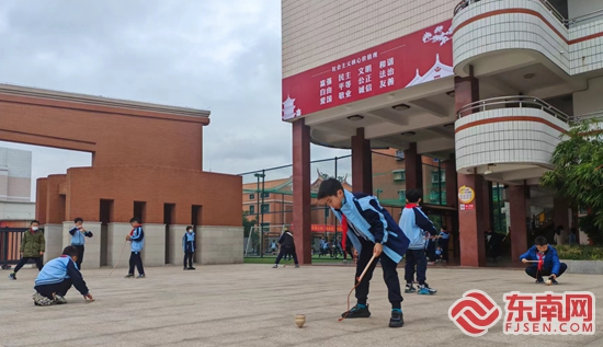 原來,為了豐富學生們的課間生活,該校推出了“你好,10分鐘”?!岸靵砼R,不少‘小懶蟲’們課間都‘窩’在教室里,不愿去操場動一動。于是,我們從學生們的興趣入手,充分利用操場、走廊等空間,并添置一批器材,把閩南童玩引入校園,讓每個學生參與其中,盡情享受課間10分鐘的快樂時光?!睂W校校長曾鳳蓉介紹道。