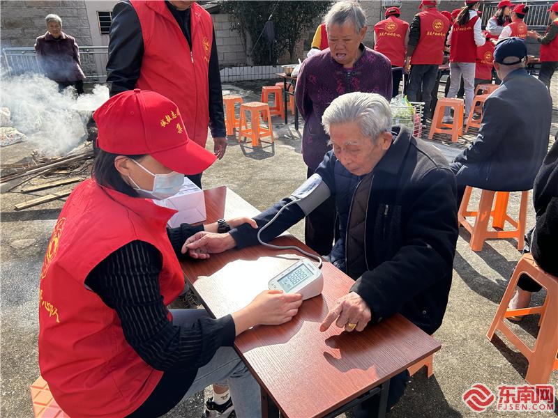 冬至主題活動現(xiàn)場,盧媽媽愛心隊志愿者為老人義診(黃地村新時代文明實踐站供圖)