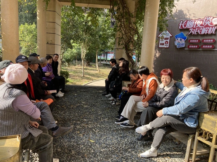在河?xùn)|鄉(xiāng)水東社區(qū)新時代文明實踐講習(xí)點,群眾圍坐一堂,通過吃茶話事,反應(yīng)社區(qū)安全隱患問題。朱小燕 范彌翔 攝