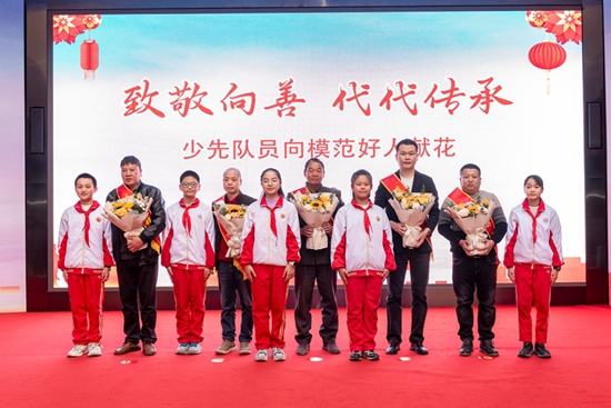 少先隊員們?yōu)槟7逗萌缩r花。德化縣委文明辦 供圖