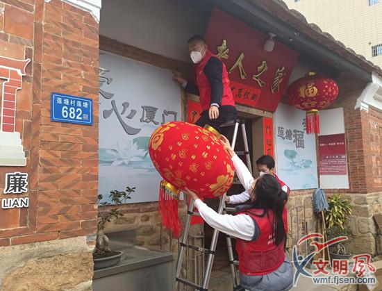 志愿者掛紅燈籠(蓮塘村新時(shí)代文明實(shí)踐站 供圖)