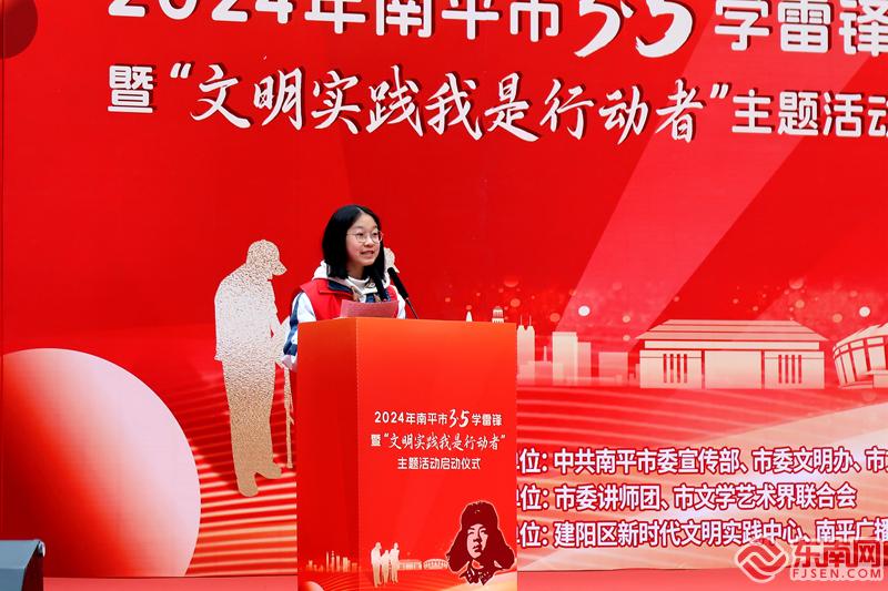全國優(yōu)秀志愿者、福建省新時代好少年勞思妤作為志愿者代表,向社會發(fā)起“向雷鋒同志學(xué)習(xí),人人爭做文明實踐的先行者”的號召。肖練冰 攝
