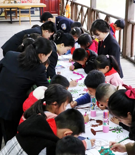 志愿者和學(xué)生們共同繪制《我和小樹一同成長》長卷。安溪法院供圖