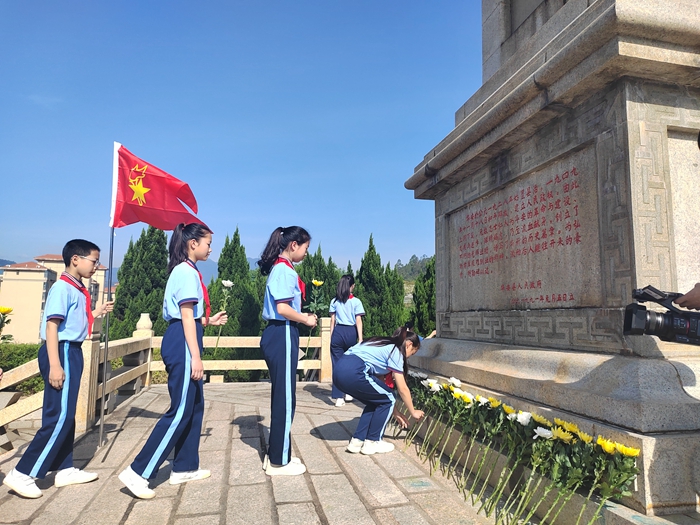學(xué)生們在紀(jì)念碑前為烈士們獻(xiàn)上鮮花