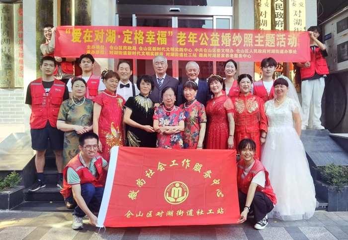 文明風(fēng)5月15日訊 為弘揚(yáng)中華民族尊老、敬老、愛老的傳統(tǒng)美德,讓長(zhǎng)者們?cè)诩议T口圓一個(gè)婚紗夢(mèng),近日,由倉(cāng)山區(qū)民政局、倉(cāng)山區(qū)新時(shí)代文明實(shí)踐中心、中共倉(cāng)山區(qū)委文明辦,對(duì)湖街道黨工委、辦事處主辦,對(duì)湖街道社工站、對(duì)湖街道新時(shí)代文明實(shí)踐所、微尚對(duì)湖居家養(yǎng)老服務(wù)中心共同承辦的“愛在對(duì)湖?定格幸?!崩夏旯婊榧喤臄z活動(dòng)在對(duì)湖街道新時(shí)代文明實(shí)踐所開展。活動(dòng)邀請(qǐng)了專業(yè)攝影團(tuán)隊(duì)為轄區(qū)金婚夫婦、視障群體、高齡老人等20多對(duì)長(zhǎng)者夫妻免費(fèi)拍攝婚紗照。