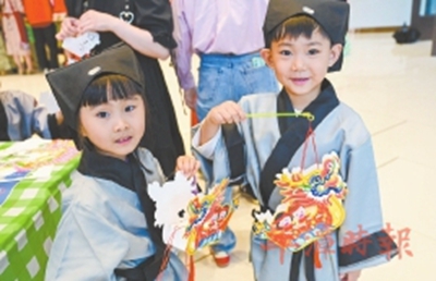 小朋友們展示參與制作的龍舟燈。