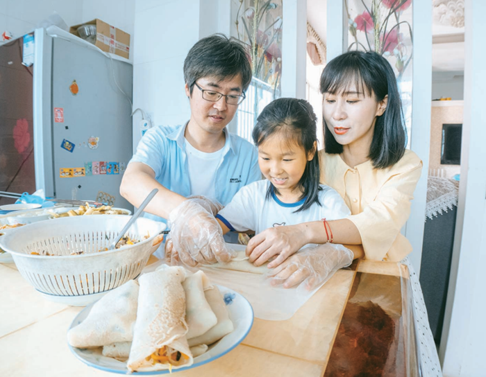 在李麗虹的耐心指導(dǎo)下,一家三口熟練地將餡料放在面皮中央,然后將面皮折疊,最終成功卷出10多卷香噴噴的美味面餅?!半m然之前一直看長輩們煎面餅,但自己動手才發(fā)現(xiàn)并非易事。不過在媽媽的悉心指導(dǎo)下,也掌握了技巧,這次獨特的體驗是珍貴的家庭回憶?!眲⒁阅f。