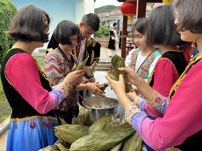 在“團結粽連心”包粽子活動中,航城街道錦輝社區(qū)居民手把手教授長樂華僑中學新疆班學生包粽子。捋粽葉、做漏斗狀、填糯米、添餡料、壓緊實、封口、扎捆,一片片清香的粽葉、一粒粒晶瑩的糯米,在一雙雙巧手下,轉眼變成一個個棱角分明的粽子?,F(xiàn)場其樂融融,洋溢著民族團結一家親的濃厚氛圍。