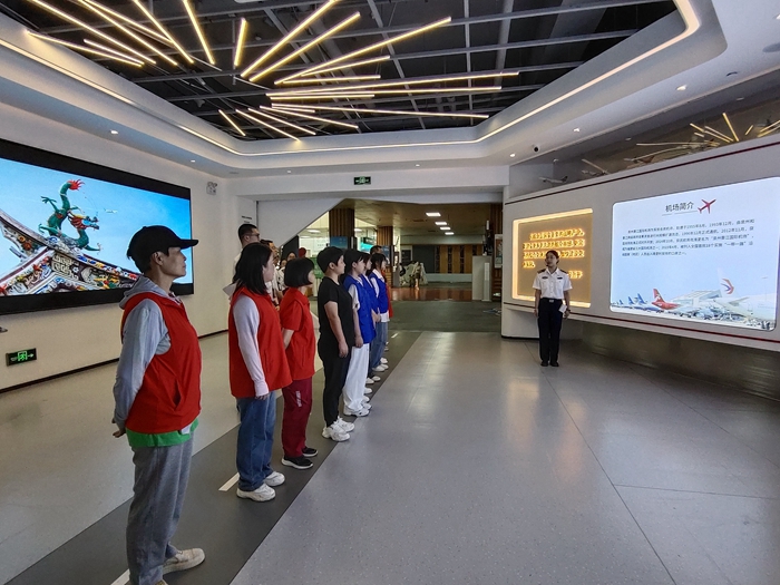 在泉州晉江國(guó)際機(jī)場(chǎng)新時(shí)代文明實(shí)踐基地,參加此次活動(dòng)的泉州職業(yè)技術(shù)大學(xué)學(xué)生代表、志愿者代表、機(jī)場(chǎng)員工代表等,參觀學(xué)習(xí)了機(jī)場(chǎng)現(xiàn)場(chǎng)展示點(diǎn),認(rèn)真聆聽(tīng)講解員的介紹。