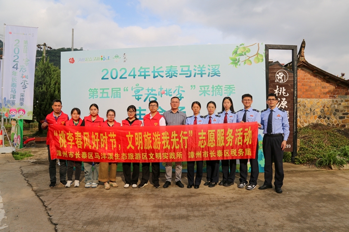 長泰區(qū)馬洋溪生態(tài)旅游區(qū)新時代文明實踐所與漳州市長泰區(qū)稅務局結對共建,雙方組建成一支20多人的志愿服務隊伍。在2024年4月26日第五屆“宴若桃李”采摘季活動,通過迎客指路、產品介紹,幫助游客體驗各項采摘游玩項目,倡導共建文明、健康、和諧的旅游環(huán)境,全面宣傳文明旅游知識等方式,為游客提供全面細致的志愿服務。全方位、多層面展示了馬洋溪桃李產業(yè)發(fā)展狀況、果品品質和品牌形象,實現桃李暢銷、助農更富農,直接服務游客達300余人。