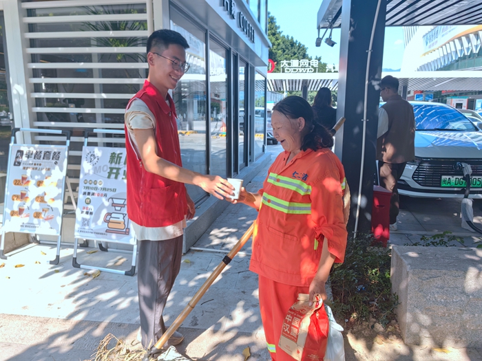 茶園街道新時(shí)代文明實(shí)踐所依托八閩第一站、環(huán)南社區(qū)新時(shí)代文明實(shí)踐站、東浦社區(qū)新時(shí)代文明實(shí)踐站設(shè)立的“愛心茶攤”再次“開張”啦?!靶量嗔?,大哥,喝杯水消消暑吧?!薄疤鞖膺@么熱,大姐要小心中暑哦!”一杯杯茶杯,一句句慰問,一遍遍囑咐,是志愿者們力所能及地為堅(jiān)守奮戰(zhàn)在一線勞動者撐起的“綠蔭”。
