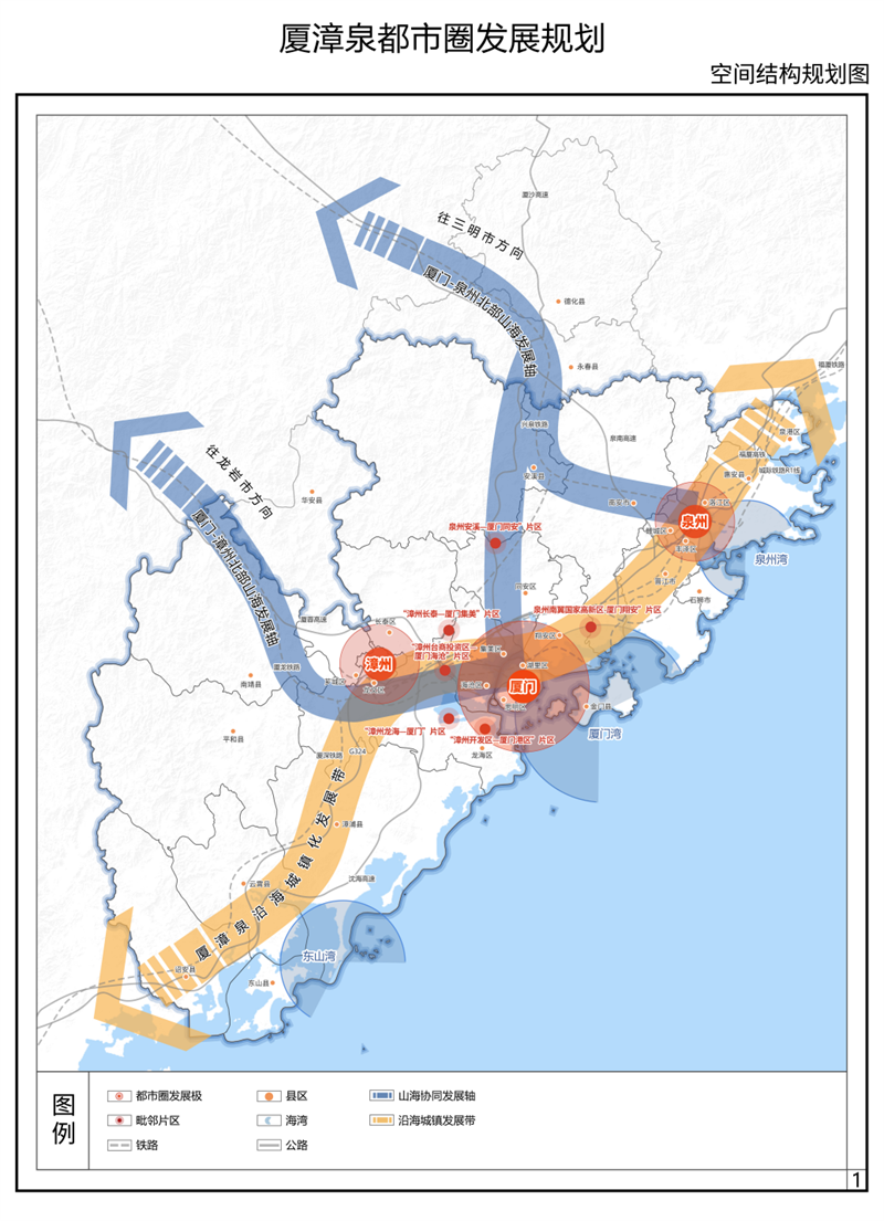 積極融入全省“兩極兩帶三軸六灣區(qū)”主架構(gòu),擴大三市主城區(qū)的經(jīng)濟輻射范圍,推動城鄉(xiāng)融合發(fā)展,促進大中小城市和小城鎮(zhèn)協(xié)調(diào)發(fā)展,構(gòu)建“一帶集聚、兩軸協(xié)同、三核引領(lǐng)、多片合作”高質(zhì)量發(fā)展的廈漳泉都市圈空間格局。