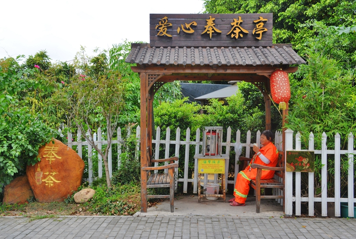 在晉江市區(qū)和平路機(jī)場(chǎng)對(duì)面,綠樹花叢掩映中有一座古色古香的“愛心奉茶亭”,亭內(nèi)有茶水、一次性杯子,亭子兩側(cè)設(shè)有座椅,給需要避暑歇腳的人帶來諸多便利。