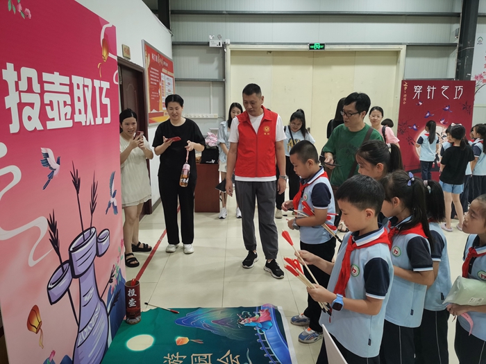 在“七夕乞巧 共賞民俗——七夕游園會”環(huán)節(jié)中,志愿者為孩子們準備了“穿針乞巧”“投壺取巧”和“趣釣巧果”三個民俗游戲體驗區(qū)。在“穿針乞巧”民俗游戲體驗中,孩子們引五色彩線,穿七孔針,巧手慧心來“賽巧”。在“投壺取巧”民俗體驗中,志愿者組織孩子們體驗悠久歷史的“射”禮,領(lǐng)略古人尚禮的精神,感受中國傳統(tǒng)禮儀。在“趣釣巧果”游戲體驗中,志愿者帶領(lǐng)孩子們用新式玩法體驗古代傳統(tǒng)七夕游戲,沉浸式感受傳統(tǒng)文化的魅力。