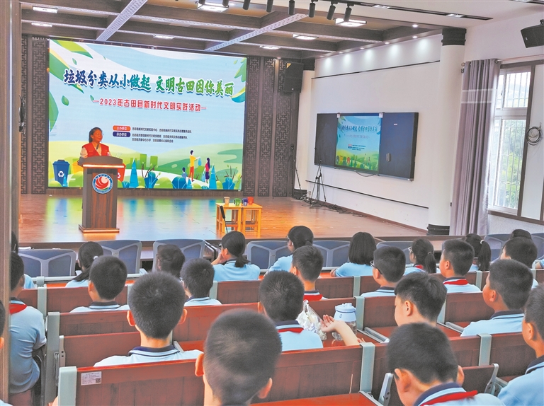 古田縣愛心公益聯(lián)合會(huì)志愿者在鳳都鎮(zhèn)中心小學(xué)開展“垃圾分類從小做起 文明古田因你美麗”垃圾分類進(jìn)校園活動(dòng)