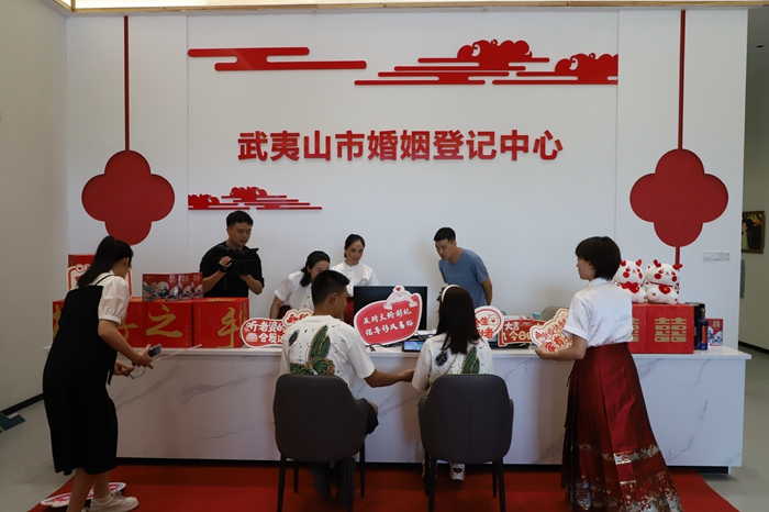 今年七夕恰逢周六,武夷山市民政局為“愛”加班,在印象大紅袍的武夷山市婚姻登記中心戶外辦證基地,工作人員語重心長地向前來登記的新人宣傳新式婚俗的優(yōu)點,倡議他們破除陋習,簡辦婚禮。新人們紛紛點頭贊同,承諾將把喜事新辦、簡辦。