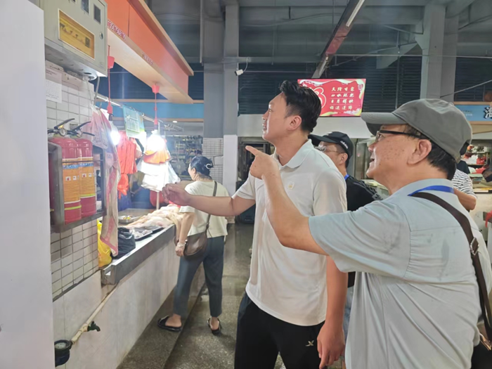 文明觀察團(tuán)成員正在查看紅杏商場(chǎng)內(nèi)消防設(shè)施情況