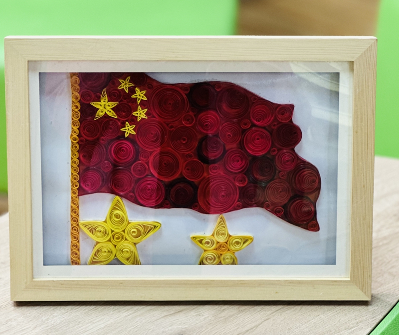 在衍紙工坊,一幅紅色的“中國(guó)地圖”衍紙畫(huà)頗為搶眼,這幅衍紙畫(huà)以一個(gè)個(gè)紅色卷紙筒拼出中國(guó)地圖的輪廓,又以一個(gè)個(gè)黃色卷紙筒拼出“中國(guó)”二字鑲嵌其中,畫(huà)面立體、穩(wěn)重、大氣。衍紙畫(huà),又稱(chēng)卷紙畫(huà),就是把一張張平面彩帶卷成一個(gè)個(gè)立體“零件”,再把一個(gè)個(gè)立體“零件”拼裝成一束花、一張畫(huà)、一幅地圖……在松航小學(xué)衍紙工坊,孩子們不僅能接觸到衍紙藝術(shù),還能深入了解竹編技藝。
