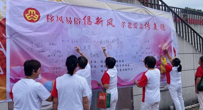 活動(dòng)伊始,廣場舞志愿者們踴躍在簽名墻上簽名。隨后,明溪縣新時(shí)代文明實(shí)踐中心聚焦群眾煩心的高價(jià)彩禮問題,以“移風(fēng)易俗進(jìn)家庭”活動(dòng)為契機(jī),引導(dǎo)志愿者們通過舞蹈、歌曲、詩朗誦等群眾喜聞樂見的形式宣傳移風(fēng)易俗,將“抵制高價(jià)彩禮 倡導(dǎo)婚嫁新風(fēng)”的理念帶入廣大家庭。活動(dòng)最后,還邀請(qǐng)志愿者宣讀了《抵制高價(jià)彩禮 “典”亮婚嫁新風(fēng)》倡議書。