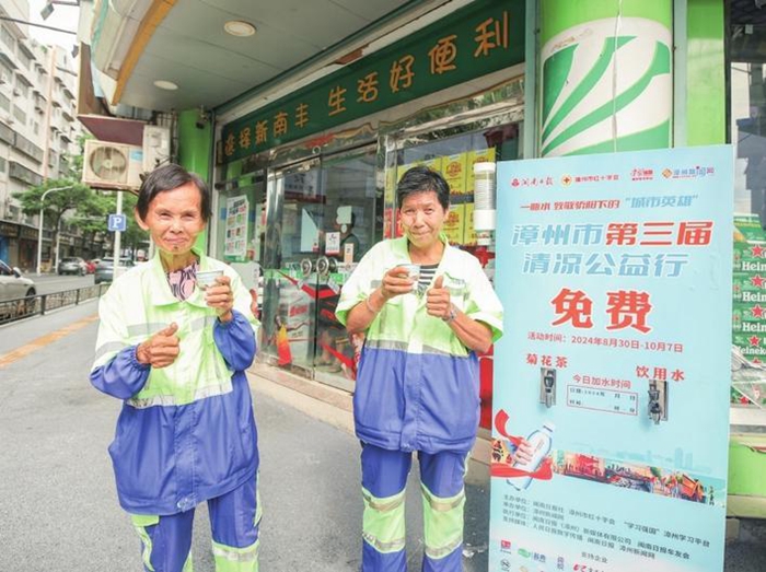 為了擴(kuò)大公益覆蓋面,在組織志愿者送水之余,主辦方聯(lián)合漳州新南豐商業(yè)連鎖有限公司,在閩南日報社新聞大樓和市區(qū)新南豐便利店設(shè)立20個“清涼補(bǔ)給柜”,24小時為周邊戶外工作者、社區(qū)居民、學(xué)生等群體免費(fèi)提供菊花茶和飲用水。
