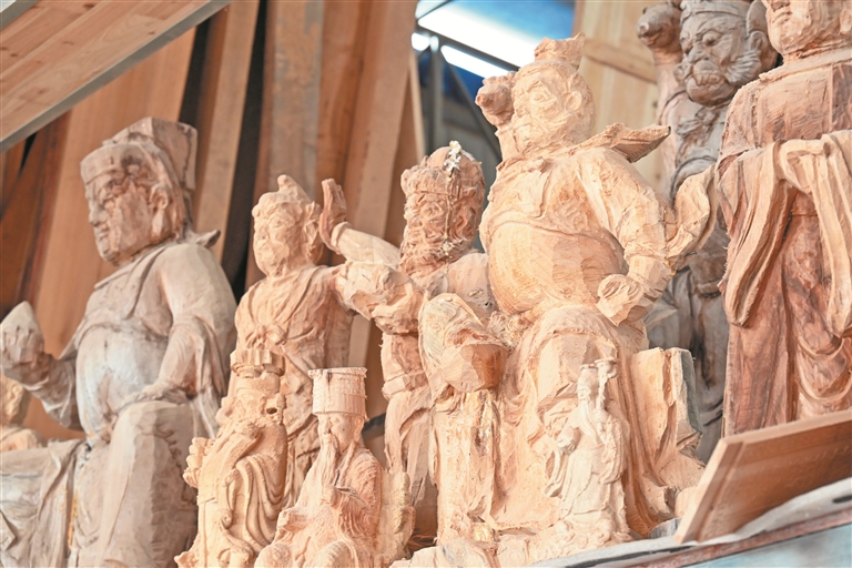 木構(gòu)件雕刻完成后,賴奶楊對其進行細致打磨、拋光。“打磨是一項很重要的工序,讓木雕表面更加光滑、自然?!辟嚹虠钫f。