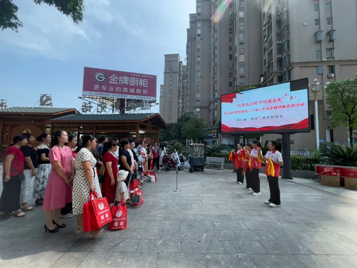 “宣揚(yáng)黨的二十大,百年大黨正風(fēng)發(fā);報(bào)告內(nèi)容很豐富, 高舉旗幟真鮮明……”“春雨”理論宣講隊(duì)的青年宣講員用快板三句半,把黨的二十大好聲音送到群眾身邊?!按迩f整潔馬路寬,文化娛樂(lè)場(chǎng)地好,移風(fēng)易俗樂(lè)陶陶……”朗朗上口的快板詞接地氣、聚人氣,老百姓聽(tīng)著清、記得牢。