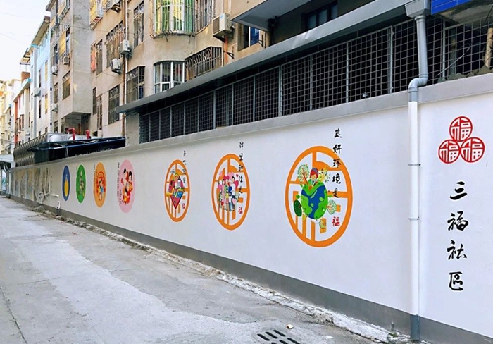 “我們充分利用老舊墻面進(jìn)行繪畫(huà)創(chuàng)作,打造多彩文化墻與美麗街巷,不僅美化了人居環(huán)境,還體現(xiàn)了文化特色。此外,社區(qū)黨支部還積極探索實(shí)踐‘黨建+’模式,深度融合福文化,做足做細(xì)福文章,壘起‘三福圈’ ,潑墨‘福底色’?!?三福社區(qū)黨支部書(shū)記陳文說(shuō)。