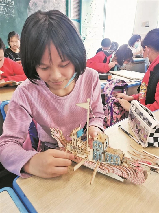 學(xué)生用木片、膠水制作福船模型(受訪者供圖)