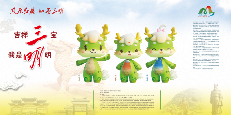 “明明”吉祥物以三明麒麟山之傳說祥瑞獸為創(chuàng)作原型,通體以青綠為主色調(diào),頭頂白石祥云(閩山第一巔)、四肢綠水清波、尾銜市花迎春,力求呈現(xiàn)三明“青山綠水是無價之寶”獨特氣質(zhì),塑造吉祥三寶一族活潑可愛、憨態(tài)可掬的動漫卡通形象。