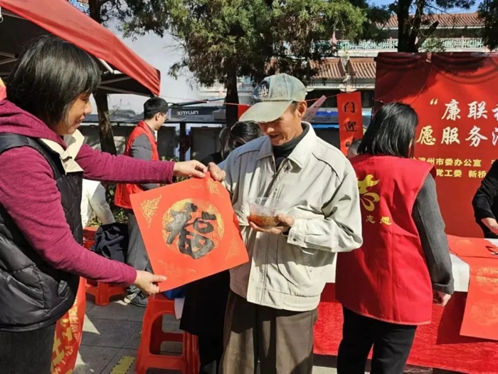 薌城區(qū)下沙社區(qū)新時(shí)代文明實(shí)踐站聯(lián)合市委辦機(jī)關(guān)黨委開展“廉聯(lián)福至,粥情共融”志愿服務(wù)活動(dòng)暨主題黨日活動(dòng)。黨員志愿者們將一張張“?!弊帧⒁桓备睂?duì)聯(lián)及一碗碗香甜的臘八粥送到社區(qū)居民手中,與社區(qū)居民面對(duì)面親切話家常、聽心聲,為他們送去黨組織的關(guān)心關(guān)懷,讓廉潔文化深入民心,引導(dǎo)居民群眾崇尚廉潔、弘揚(yáng)正氣,共樹文明新風(fēng)。