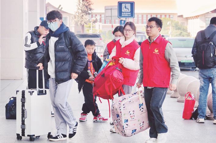 春運(yùn)首日,青年志愿者為乘客搬運(yùn)行李,提供暖心服務(wù)。 李林 攝