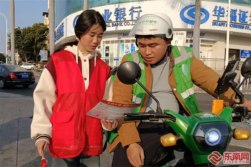 志愿者向騎手發(fā)放文明交通宣傳單(三秀社區(qū)新時代文明實踐站供圖)