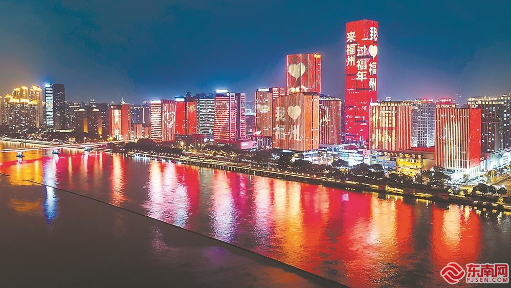 21日起,福州閩江北岸海峽金融商務(wù)區(qū)(上圖)、五一廣場、東街口等多處地標建筑推出“來福州,過福年”主題燈光秀以及在LED大屏滾動播放新春海報,充滿濃濃年味。