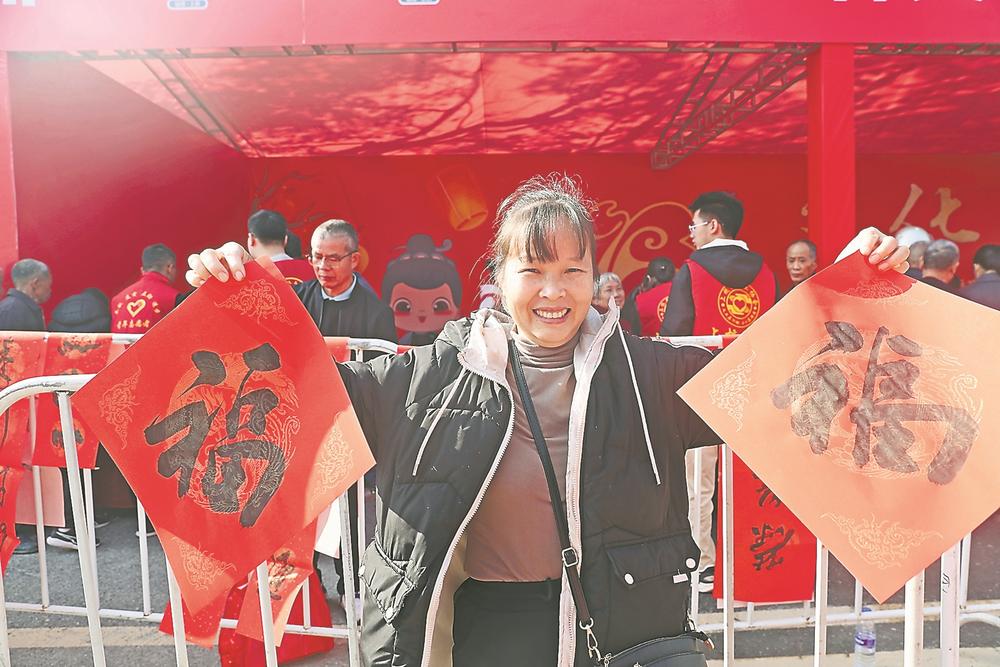 “?!蔽幕矚庋笱?。省委宣傳部服務點前,大家排起長隊領取“?!蔽幕即?、中國結等;省文聯服務點前,工作人員給大家寫下一副副飽含祝福的春聯;拓印體驗活動臺前,古籍修復師指導大家拓印“?!弊帧?/p>