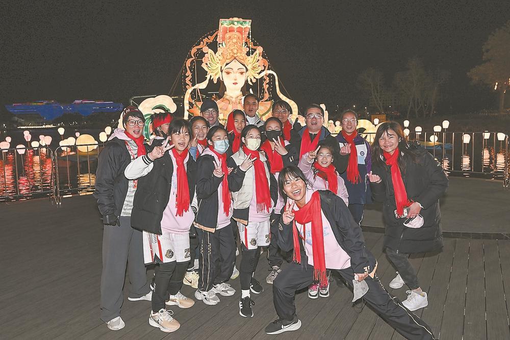 在榕參加2025年福州市晉安區(qū)榕臺(tái)青少年研學(xué)營(yíng)的兩岸師生在媽祖花燈前合影。福建日?qǐng)?bào)記者 吳恩兒 攝
